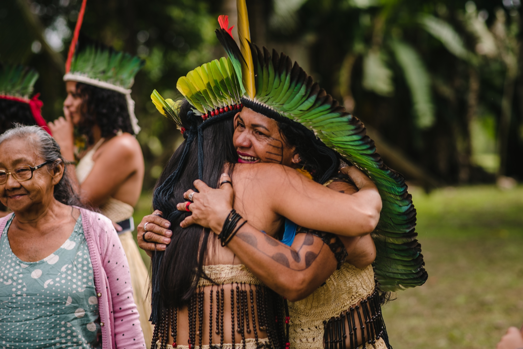 One man in a green headdress asks me for a selfie, then sits down with a guitar and plays a few folksy melodies. Girls take pictures of each other on their phones (everyone has a phone), putting on red lipstick to match the feathers in their hair; children peer from behind their mothers’ legs, tugging at their tiny headdresses and staring at the visiting “gringos”. We’re ushered into the newly built longhouse, which Maria hopes to open to eco-tourists one day, and the kids plop down on the floor to draw pictures of rainforest animals — jaguars, parrots, an inexplicable yellow dog — and tell us the Nukini name for each one. Two elderly women are given seats to watch it all. “They call me the ‘library’,” says one, grinning. She was taught the Nukini language by her mother. “When we got our land back from the government, the songs, the stories and the crafts started to come back,” she says. Right on cue, Maria and her teacher friends boss everyone into a circle, where they hold hands and sing a traditional Nukini song, before taking it in turns to make emotional speeches to thank SOS Amazônia and TCFF. There are tears on all sides.